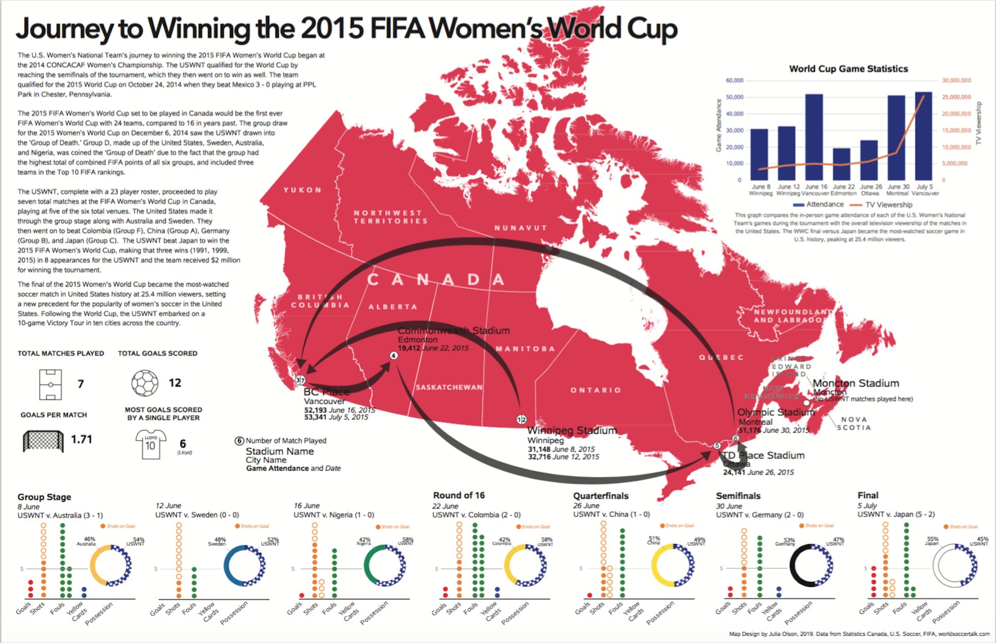 A static map that chronicles the United States Women's National Team on their journey to winning the 2015 FIFA Women's World Cup in Canada. The main map focuses on the cross-country travel that was required during the tournament by the USWNT, as well as those stadiums that were utilized and the attendance during those games. The illustrated infographics underneath the main text are meant to pull out meaningful statistics from the USWNT during the tournament as a whole, highlighting impressive feats. The game-by-game infographics along the bottom summarize each match by score, as well as other soccer-specific metrics like fouls and possession.